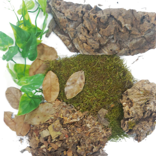 Have a pet snail that you’d like to spoil? Our snail decorations pack is suitable for an enclosure for up to 2 large snails. Items can be cut down to the correct size as required. The decor pack comprises natural articles including cork bark pieces leaves, moss, lichen encrusted wood etc as well as faux plant stems (so they dont get eaten by the snails!). Items may vary from the picture depending on availability. The decor pack is designed to provide a naturalistic and attractive habitat for your snail including hide oportunities combined with mosses and leaves to replicate the natural environment of the forest floor. Please note, substrate/soil is not included and must be purchased separately if required.